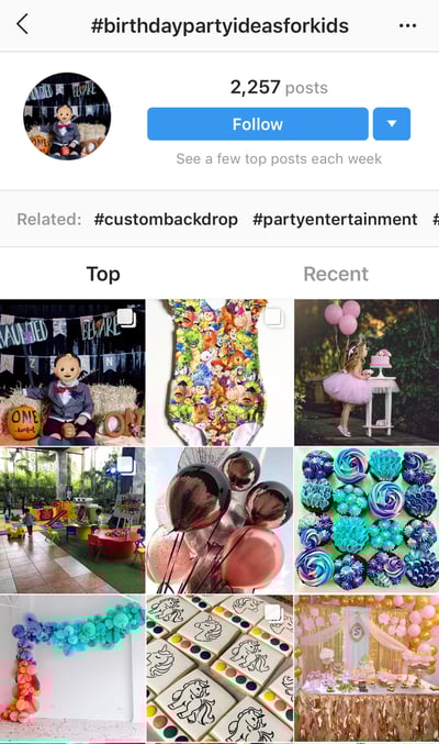 The function of a hashtag is to create a conversation around a specific topic. For example, take a look at #BirthdayPartyIdeasForKids on Instagram: